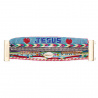 Presented here is the "Version 04" cuff, featuring multicolored cotton ties, a blue, red and purple Brazilian beaded bracelet with "jesus" inscribed at its center, a cowrie shell and the legendary sehnor da bonfim lucky charm ribbon.