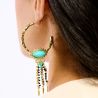 Créole pour oreilles percées, martelée à la main et dorée à l'or fin 14 carats, PEPPER dévoile une élégance vintage avec sa marquise centrale effet turquoise, son serti boule festonné et ses deux petits strass effet diamant. Déclinée en deux couleurs, elle arbore dans sa version turquoise, une cascade de perles de rocaille tressées vert de gris, turquoise, ambre et noires sublimées par de ravissantes petites palmettes.