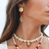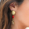 Imaginée comme un hymne à cette mer que l'on aime tant, DEEPSI est une boucle d’oreille puce pour oreilles percées, où le coquillage doré et strié effet godron, rehaussé d’une ligne centrale entièrement strassée, s’impose avec panache. La seconde partie de la boucle dévoile de petites pierres rouge corail aux contours irréguliers, ainsi qu’une branche de corail doré aux lignes ondoyantes.