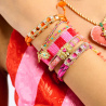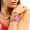 FELYNI incarne à la perfection ce mélange de genres que nous chérissons chez Hipanema. Dans un design unique et iconique, il fait se rencontrer un savoir-faire artisanal – avec un corps de bracelet entièrement perlé de perles tubes colorées – et un esprit baroque, porté par une pampille cossue ornée d’un cœur et de fleurs en acier inoxydable doré et sublimés par des strass effet diamant. Décliné en cinq couleurs, il est ici dans sa déclinaison rose où le coeur est rose effet tourmaline, les pistilles effet diamant et les perles roses, corail, argent et dorées.