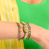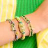 FELYNI incarne à la perfection ce mélange de genres que nous chérissons chez Hipanema. Dans un design unique et iconique, il fait se rencontrer un savoir-faire artisanal – avec un corps de bracelet entièrement perlé de perles tubes colorées – et un esprit baroque, porté par une pampille cossue ornée d’un cœur et de fleurs en acier inoxydable doré et sublimés par des strass effet diamant. Décliné en cinq couleurs, il est ici dans sa déclinaison verte où le coeur et les pistilles sont blanc cristal effet diamant et les perles sont vertes, jaune acide, turquoise, blanches, ocre et noires.
