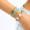 En acier inoxydable doré, il se compose de perles irrégulières aux formes évoquant le corail. Au centre, deux cauris ornés de pampilles strassées effet diamant captent la lumière, tandis que cinq pampilles aux fleurs strassées bohèmes ajoutent une touche de délicatesse. ll se décline en trois couleurs : blanc, corail et turquoise.