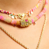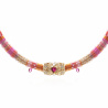 Décliné en cinq coloris, le modèle rose associe des perles roses, dorées, corail et argentées ponctuées de petites pampilles effet tourmaline pour une allure à la fois romantique et éclatante.