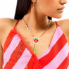 Ici, le collier BONITO : un sautoir coloré dont la chaîne fleur en acier inoxydable doré, met en valeur un cartouche perlé d'où se balance un pompon généreux aux teintes vibrantes.