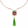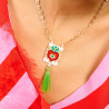 Décliné en six coloris, BONITO s’affiche ici en version verte avec un cartouche blanc orné d’un cœur effet ex voto aux nuances vertes, rouges, blanches, turquoise et lie de vin et un pompon vert éclatant. Les fleurs de la chaîne sont ponctuées de pistils en émail orange.