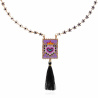 Décliné en six coloris, BONITO s’affiche ici en version noire avec un cartouche orné d’un cœur gaphique aux nuances dorées, lilas, fuchsia, jaunes, oranges et noires et un pompon noir. Les fleurs de la chaîne sont ponctuées de pistils en émail violet.
