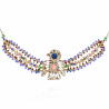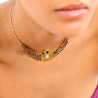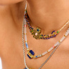 À chaque extrémité, deux liens finement perlés et prolongés sur un lien de fils tressés viennent compléter la pièce avec élégance, jouant sur des contrastes de teintes pour un rendu à la fois bohème et sophistiqué. Proposé en trois couleurs, le modèle indigo combine harmonieusement des perles dorées, bleu clair, bleu marine, turquoise, rose pâle, vert et ambre.
