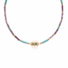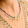 Décliné en trois nuances, KOMBOU — parfaitement assorti aux boucles d’oreilles LOMBOK — se pare dans sa version lilas d’une pierre en quartz, cerclée d’une monture dorée ouvragée ornée d’un émail turquoise et s'accompagne de perles tubes dans des teintes turquoise, améthyste et dorées.