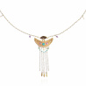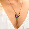 Les perles facettées, aux reflets cristallins et aux nuances violet améthyste, évoquent l’esprit d’un chapelet raffiné. Pour parfaire cette création, un pompon mêlant chaîne dorée et perles de rocaille turquoise et vertes vient clôturer l’ensemble avec élégance.