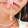 Décliné en trois harmonies de couleurs, FYN se présente ici dans sa version corail : sa chaîne chapelet s’anime de perles de rocaille en jaspe rouge, cornaline et corail, tandis que la dent, taillée en cornaline, est sublimée par de subtils strass effet diamant.