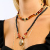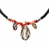 Décliné en deux couleurs, il se pare, dans sa version noire, de rondelles noires, de perles en coquillage veritable de couleur ambre et de trois cauris dorés dont le plus grand arbore en son centre un strass effet diamant.