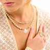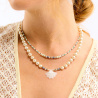 Le second lien, plus long, alterne des perles régulières légèrement cossues, évoquant la rondeur des perles de culture, entrecoupées de délicates rondelles dorées et de perles en pierre de lune.