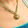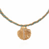 En son centre, une pampille imposante en cauri doré à l’or fin attire tous les regards. Orné d’une élégante ligne de strass effet diamant, ce coquillage précieux apporte à l’ensemble une touche solaire et précieuse, évoquant l’esprit des bijoux marins revisités.